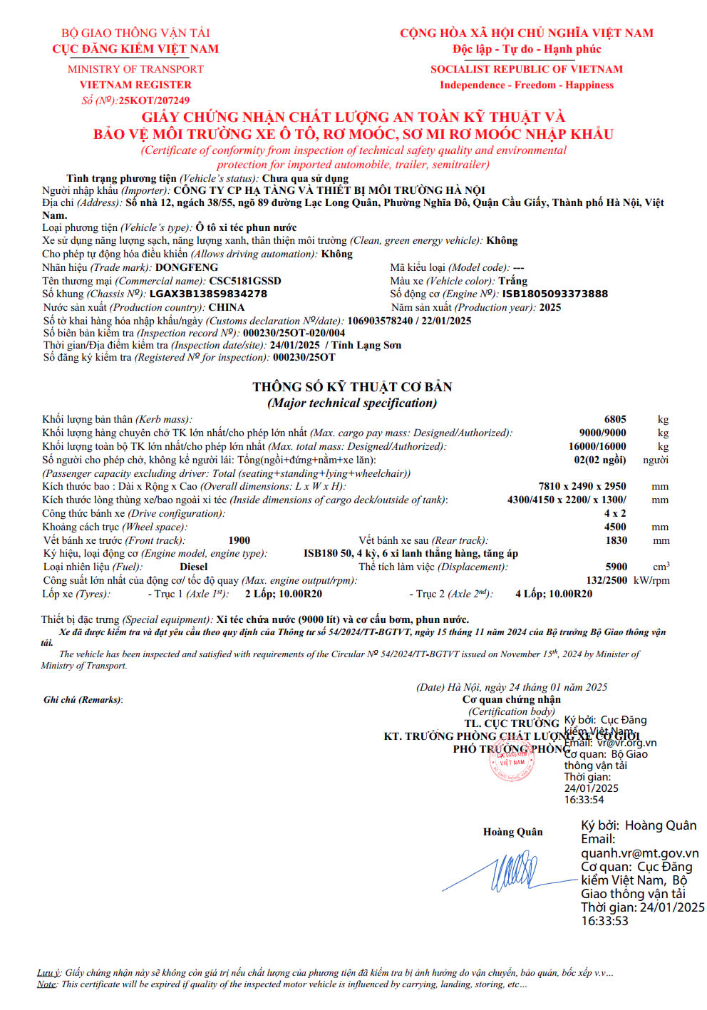 Kích thước tổng thể DxRxC (mm) 7170×2470×2890 Tiêu chuẩn khí thải Đạt tiêu chuẩn khí thải EURO V, sử dụng chất phụ gia Diesel.