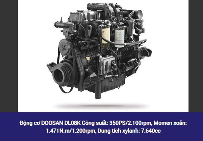 – Kiểu động cơ: Doosan DE12TIS, Turbo tăng áp, làm mát bằng nước, ga cơ